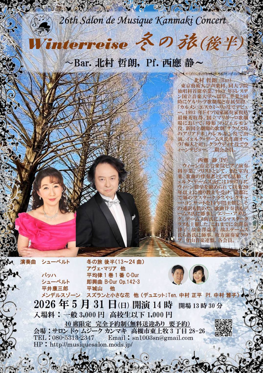 - 2026年5月31日(日)14:00開演(13:30開場) Winterreise 冬の旅(後半)〜Bar.北村哲郎 Pf.西應静〜